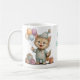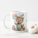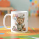 Esta encantadora taza presenta un adorable gatito vestido con un tierno pijama y gorrito, sosteniendo globos de colores y rodeado de pequeños regalos, creando una escena dulce y festiva. Su diseño estilo acuarela, con tonos suaves y detalles delicados, la convierte en el regalo perfecto para cumpleaños infantiles o para sorprender a alguien especial. Ideal para disfrutar de bebidas calientes mientras se añade un toque de alegría y ternura al día.