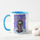 La Mug de Fêtes du Petit Reindeer présente notre oeuvre originale d'un renne décoré pour Noël avec un casquette du Père Noël rouge et blanc brillant, perché entre un grand rack de bois. Ce renne humoristique se dresse dans un paysage enneigé avec un ciel étoilé texturé et une bordure ondulée d'un bleu et d'une orange amusants. Vous trouverez le renne amusant qui va et vient avec la tête du renne d'un côté et le renne de l'autre côté. Ce caribou qui aime les vacances porte une couronne sainte avec un arc rouge vif sur son dos. Partagez un sourire aujourd'hui avec cet amant des rennes, amoureux des caribous, amoureux des animaux, amoureux des animaux sauvage, amoureux de l'art amusant sur votre liste de cadeaux cette saison de fêtes.
