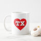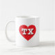 Cette tasse présente un coeur rouge vif contenant les lettres coques TX, en haut blanc et audacieuses, l'abréviation officielle du Texas, l'état étoilé solitaire.