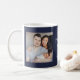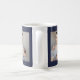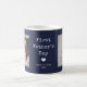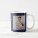 Cette simple tasse photo en Fête des pères bleue et blanche pour la première fois père dispose d'un arrière - plan bleu marine foncé avec une typographie de texte de machine à écrire vintage blanche qui dit "Première Fête des pères." Ajoutez deux photos du nouveau père et du bébé, avec la place pour personnaliser avec les noms et l'année.
