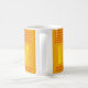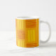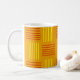 Cette tasse présente un design moderne du milieu du siècle qui ressemble à un tissage avec des lignes rouges et jaunes sur un champ d'or.