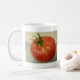 Une tomate Brandywine fraîche de la vigne attend son sort.