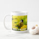 Petite tache jaune sur une brindille d'érable entourée de feuilles jaunes. La saison de l'automne doré. La couleur de l'oiseau correspond à la couleur des feuilles. Tasse à café amusante. Vous pouvez modifier ou supprimer l'image et le texte Robe à la saison