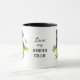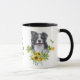 "LOVE MY BORDER COLLIE" déclare cette tasse pour le fier propriétaire de Border Collie. Chaque côté de la tasse a un beau portrait d'aquarelle d'une collie noire et blanche encadrée de fleurs de tournesol et de feuilles verts. Mélangés sont des sprigs d'eucalyptus bleu vert. Entre les deux images est le texte, qui peut être facilement customisé, ou même supprimé, par vous.
