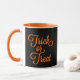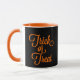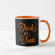 Classiquement grand Trick ou Treat Halloween design en texte orange avec tasse à café arrière - plan noir. Parfait pour boire votre café épice citrouille !