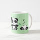 Trois adorables petits pandas assis les uns à côté des autres. Un heureux panda porte un tee - shirt avec "I heart panda" écrit dessus. Un autre propose un bâton de bambou vert à un troisième panda qui s'est endormi.