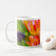 Tulipes colorées sur un parterre de fleurs. Pratiquement toutes les couleurs de l'arc-en-ciel présentes. Scène florale lumineuse et positive. Photographie macro.