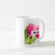 Une tasse avec une belle photo de printemps avec 2 tulipes roses et des feuilles vert vif.
