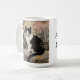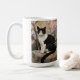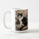 Aquarelle illustrant le chat noir et blanc assis sur un rocher dans un jardin. Customisez cette tasse avec votre nom !