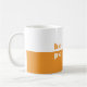 Cette tasse unique est dotée d'un nom personnalisable dans la typographie de chunky. La tasse est divisée en blocs de couleur blanc et orange mangue, avec le nom en orange sur un arrière - plan blanc sur la moitié supérieure, et mis en miroir à l'envers en blanc sur un arrière - plan orange sur la moitié inférieure.