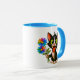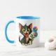 Un chat mignon sur une mug : une image pleine de vie, un univers coloré avec un chat noir et blanc, une scène joyeuse et vivante. Trop mignon avec ses yeux expressifs et son bouquet de fleurs colorées, cette image apporte une touche de bonheur et de tendresse.