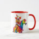Un clown rigolo avec son gros nez rouge, son grand sourire et son maquillage blanc éclatant chevauche un cheval multicolore avec une crinière arc-en-ciel, son costume à pois avec des manches rayées et une collerette jaune donne un effet encore plus drôle, ses cheveux roux ébouriffés volent au vent pendant qu’il s’accroche aux rênes roses de sa monture magique, il fait des grimaces rigolotes et semble prêt à faire une blague hilarante dans un spectacle de cirque rempli de couleurs et de rires d’enfants.