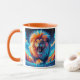 Un énorme lion court avec un regard intense et un rugissement impressionnant. Sa crinière a des couleurs de feu, mélangées avec du bleu et de l’orange. Le ciel bleu et les nuages donnent un effet féerique. L’herbe et les arbres colorés semblent sortis d’un rêve. Ce lion dégage une force incroyable et donne l’impression qu’il saute hors de l’image. Il a l’air à la fois majestueux et un peu effrayant.