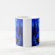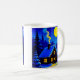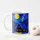 Un mug décoré avec un image représentant une maison au style chalet, dans une nuit de pleine lune en hiver sous la neige dans la forêt, la cheminée fume.