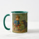 Mug avec un chien agressif qui aboie devant un enfant, le petit garçon en costume de super-héros n'a pas peur, ses yeux ont un regard tenace.