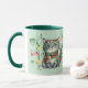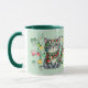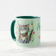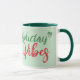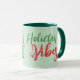 Café vert à deux tons / thé / chocolat chaud Idée cadeau Mug pour Noël. Avec un chat mignon, aimez les coeurs et les baubles, avec les mots 'Vibes de vacances.' Les couleurs principales sont le vert et le rouge sur un arrière - plan vert pâle.
