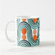 Cette tasse présente un design moderne du milieu du siècle avec des vagues turquoises et des cercles oranges.