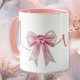 Coffee mug with pink bow, a pink stone in the center and the word love