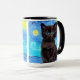 Café Mug avec un chat noir dans la peinture de Van Gogh Starry Night! Ce chaton aux yeux bleus regarde agréablement d'un arrière - plan de tourbillons bleus et d'une lune jaune vif. Un cadeau fantastique pour les amoureux de les chats et les collectionneurs d'art hollandais !