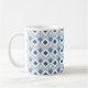 Cette tasse a un design art déco de diamants bleus poussiéreux avec des lignes diagonales et des diamants bleus foncés sur un champ de blanc.