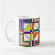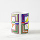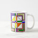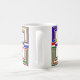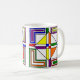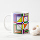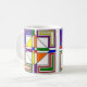 Cette tasse a un design Bauhaus de lignes, triangles, diamants et carrés qui fait un look de vitrail dans les couleurs primaires et secondaires.