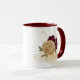 Magnifique tasse à café avec des fleurs bordeaux et beige or avec des feuilles vertes .