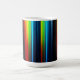 A white mug with a vibrant abstract design of colorful, glowing vertical stripes resembling a light spectrum on a dark base. (124 caractères)