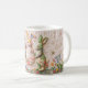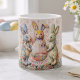 Charming coffee mug featuring vintage Easter bunnies quilted-style print design. Three adorable fabric-look rabbits with Easter egg basket and "Happy Easter" message wraps around mug. Cottage core shabby chic aesthetic. Perfect for Easter morning coffee, spring tea, or Easter gift. Nostalgic charm print.