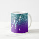 Créez votre propre dégradé violet violet et turquoise parties scintillant bokeh tasse de café étincelante avec un design de texte monogrammé moderne élégant. Customisez l'élégante calligraphie du monogramme personnalisé turquoise et blanche. Vous pouvez modifier les couleurs, les styles et les tailles des polices. La fausse parties scintillant est créée à partir d'une photo de livre... le design imprime sur le cadeau comme une photo sans étincelles ni parties scintillant. Lorsque vous transférez ce dessin à certains des autres articles cadeaux, vous pouvez ajuster ou remplir le graphisme transparent en forme d'ombre à la zone d'impression.