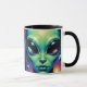 Tasse à café extra-terrestre. Un design d'un autre monde captivant, avec un alien extraterrestre qui est avec de gros yeux bombants tenant les reflets d'autres planètes, y compris la terre en eux.