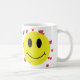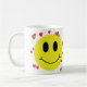 Un visage souriant et joyeux entouré de coeurs rouges.