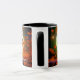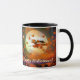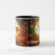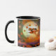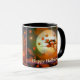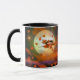 Tasse à café avec ma conception d'une sorcière sur un balai volant au-dessus d'une éffrayante pleine lune la nuit d'Halloween, remuant les feuilles d'automne. Le texte personnalisable dit "Happy Halloween".