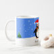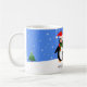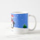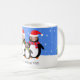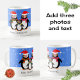 Cette tasse photo de vacances entièrement personnalisable a un design amusant avec une famille de pingouins enveloppés contre le froid. Ils portent des foulards rayés et des casquettes de noël, sur un arrière - plan de flocons de neige stylisés. Au loin se trouvent trois sapins stylisés. Téléchargez trois photos carrés d'amis ou de la famille pour créer les visages des pingouins. La légende modifiable est "Joyeux Noël 20XX". [Photographies des espaces réservés © Storytree Studios, Stanford, CA]