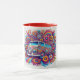 Une tasse de bus VW classique recouverte de motifs psychédéliques colorés, entourée d'énergie tourbillonnante et de fleurs vibrantes. Un design de voyage d'inspiration rétro plein de vibrations d'esprit libre.