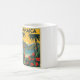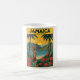 Cette affiche de voyage vintage et vibrante capture l'essence de la Jamaïque, "La Perle des Tropiques". Le design présente une superbe illustration d'une femme en tenue traditionnelle, équilibrant un panier de fruits tropicaux sur la tête tandis qu'elle marche le long d'une plage immaculée. De luxuriants lis rouges et autres feuillages tropicaux encadrent le premier plan, tandis que deux palmiers majestueux se dressent contre un coucher de soleil jaune et orange éclatant. Au loin, la mer des Caraïbes turquoise rencontre un rivage tranquille, adossé aux montagnes verdoyantes et luxuriantes de l'île.