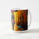 This piece captures a woman walking down the city streets with an umbrella. Its rich hues of orange, blue, and red painting a vivid image of sheer chic.