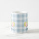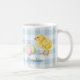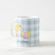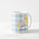 Destei's watercolor baby chick and pastel eggs. The background features a blue gingham pattern with a personalizable text area ideal for a name.
