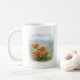 This ceramic mug features a delicate illustration of vibrant wild azaleas in bloom, set against the soft layers of misty mountains reminiscent of northern Japan. The warm orange petals contrast gently with the cool greens and blues of the distant hills, creating a balanced and serene composition.