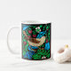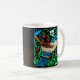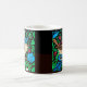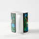 Mug dans un motif de tuiles de l'Art Nouveau William Morris, numériquement rehaussée et colorée, représentant un oiseau dans le beige et marron doux, avec des fleurs bleues vives et ceruleennes, des feuilles verts et des fraises sauvages, contre un arrière - plan noir