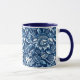 Mug dans un vintage William Morris, Art Nouveau, imprimé floral de tournesols stylisés, numériquement rehaussés et colorés, en bleu marine foncé / indigo et blanc, accentué de bleu denim clair