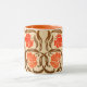 Mug dans un vintage William Morris motif textile de fleurs et de feuilles stylisés pimpernel - fleurs dans un dégradé profond de rouille orange à or, avec des feuilles jaune clair chamois, sur un arrière - plan chocolat foncé