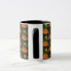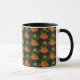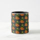 Botanic theme William Morris Style vintage Victorian floral illustration red orange green plant illustrated coffee mug on black background.