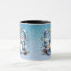 Charming winter illustration with a smiling snowman, striped scarf, blue mug of cocoa, boots and pine accents. Soft blue palette, warm accents, and cozy season feel!