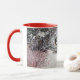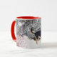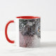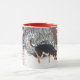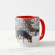 Cette image originale de Noël est un tableau d’un très mignon petit chien de race mixte noir et bronzé, il reniflait et gratte l’épaisse couche de neige fraîchement tombée qu’il vient de découvrir pour la première fois dans le jardin. Ce petit chien s’appelle Eddie, c’est un berger allemand de race croisée et il profite du froid dans son jardin d’hiver. Dans l'arrière - plan de cette image festive, vous pouvez voir un petit gnome de jardin gris tranquillement assis et lisant son livre sur le côté du petit étang gelé couvert de neige. Il y a aussi beaucoup d’arbustes de jardin enneigés et une vieille cabane en bois dans le jardin d’Eddie, tout cela ajoute de l’intérêt à cette jolie petite tasse rouge de Noël.