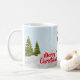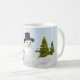 Cette tasse de bonhomme de neige a été créée à partir d'un bonhomme de neige dessiné sous forme de graphismes avec des superpositions de neige et de sapins. Personnalisez cette tasse de Noël avec vos propres mots ou achetez comme montré avec Joyeux Noël.