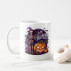 Celebrate the spooky season in style with this vibrant and festive Halloween design. A cheerful skeleton, looking dapper in a classic witch hat, offers a friendly wave from a whimsical graveyard under a starry, moonlit sky. Beside him, a large jack-o'-lantern grins with a warm, inviting glow, perfectly capturing the fun spirit of Halloween. This mug's bold colors and classic characters make it the ideal companion for sipping hot coffee, cider, or cocoa all October long. A fantastic gift for anyone who loves a perfect mix of spooky and fun.