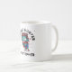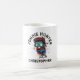 Une tasse à café personnalisée macabre avec un zombie à l'allure cool, portant des vêtements déchirés et en lambeaux avec les bras tendus à la recherche de marques. De grands yeux vides avec une peau pourrie et écossaise. Le sang éclate derrière sa tête. Le texte dit zombie chasseur, en lettres incurvées. Personnalisez avec un nom.