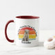 A maroon ceramic coffee mug with white text that humorously reads, "My Dog Thinks I'm Cool Dad Mug."