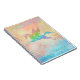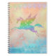 Un cheval ailé volant (Pegasus) survolant les vagues bleues, avec un arrière - plan bleu et or, et des cristaux multicolores à la dentelle au-dessus, dessinés par Petra Ortiz
