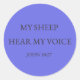This round Christian sticker features the Scripture “My sheep hear My voice” (John 10:27) in soft black typography on a calm blue-violet background.
